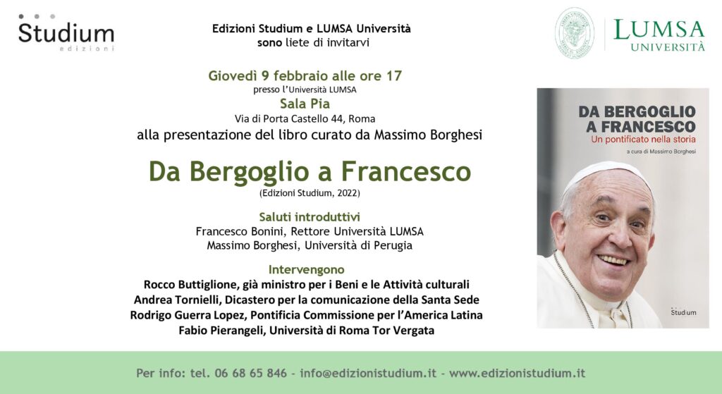 Il prof. Massimo Borghesi, ordinario di Filosofia morale presso l’Università di Perugia, presenta a Roma il libro “Da Bergoglio a Francesco. Un pontificato nella storia”, da lui curato per le Edizioni Studium di Roma nel 2022. L’incontro avrà luogo nella Sala Pia dell’Università LUMSA il 9 febbraio 2023 ore 17.00.